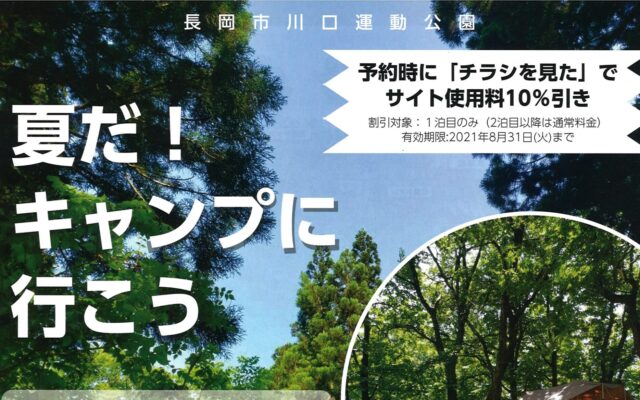 夏だ、キャンプに行こう。どこがいいかな。それなら、まずは、長岡市川口のキャンプ場を見てみよう。高原キャンプ場とオートキャンプ場があります。運動公園内では、テニスもできるし、ピクニック広場で散歩や散策もできます。越後三山(駒ヶ岳、中ノ岳、八海山)の美しい景色が見えるスポットもあります。チラシには、オートキャンプ場の割引情報が掲載してあります。