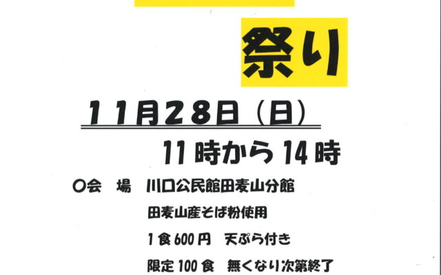 11月28日(日)11時から14時、田麦山そばの会主催で、川口公民館田麦山分館にて新そば祭りが開催されます。田麦山産そば粉でつくられた新そばに天ぷらがついて、なんと600円。限定100食、なくなり次第終了となります。参加は川口地域在住者限定、この機会に美味しいと評判の田麦山の新そばを食べてはいかがですか!