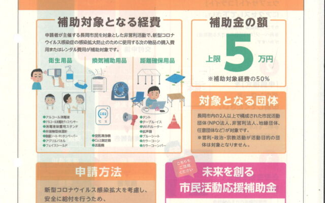 2人以上で構成されている長岡市内の市民活動団体(NPO法人、非営利法人、地縁団体、任意団体など)が、長岡市民を対象とした非営利活動で、新型コロナウイルス感染症防止のために使用する、衛生用品、換気補助用品、医療確保用品を購入する場合、補助対象経費の50%、上限5万円で長岡市が補助するものです。この補助金を自分たちの活動に活かしたい方は、ぜひ、応募してください。詳しくは、チラシをご覧ください。分からないところがある場合には、長岡市民協働センター (電話0258-39-2020)まで、お問い合わせください。また、後日、コミセンのほか、支所、きずな館、JRプラザ等にチラシを置く予定です。また、今事業のURLは 市民活動をささえる補助金 – ながおか市民協働センターウェブサイト|コライト (nkyod.org) ですので、こちらから、チラシ並びに申込書をダウンロードできます。