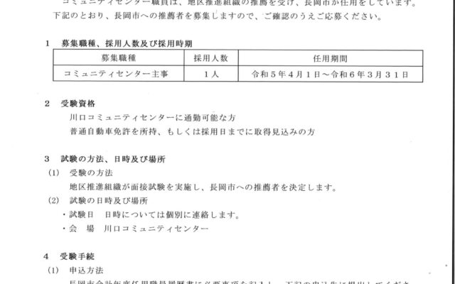 コミュニティセンター職員は、地区推進組織(川口コミュニティ推進協議会)の推薦を受け、長岡市が任命をしています。下記の募集案内のとおり、長岡市への推薦者、新規主事1名を募集しますので、ご確認のうえご募集ください。