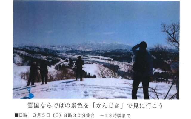 コロナの影響で延期となっていた「竹田かんじきウォーク」が、4年ぶりに再開されます。3月5回(日)8:30集合~13:00頃(当日、天候によりルートの変更あり)かんじきを履いて、雪国でしか見られない冬の景色を一緒に見ませんか ※先着20名で締め切り