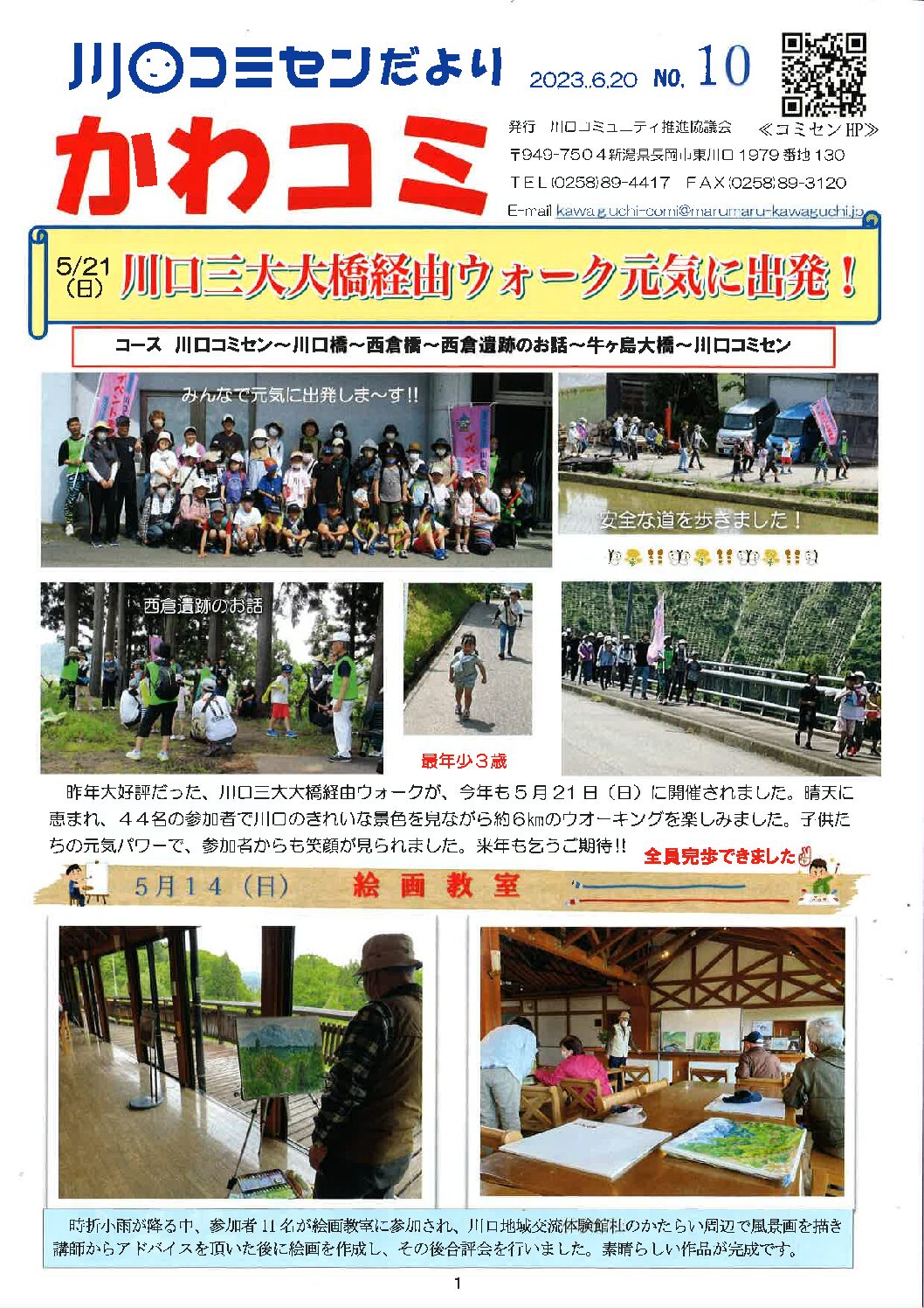 6月20日にかわコミ10号が発行されました。恒例の事業となった川口三大大橋経由ウォークを始め、各地域のイベント活動や、令和5年度の川口コミュニティ推進協議会組織図などが掲載されています。どうぞご覧ください。