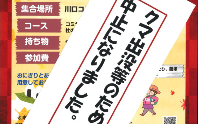 10月22日(日)に予定していました地域探訪ウォークは、熊の目撃情報などの理由により中止とさせていただきます。