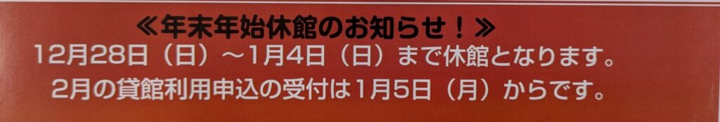 ※令和7年2月の貸館利用のご予約は1月5日(月)からです。