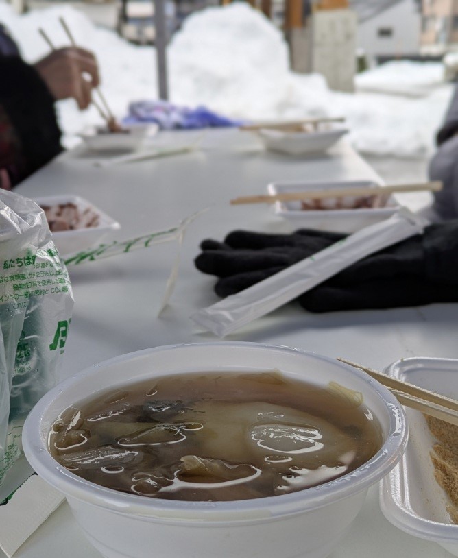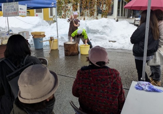 午前中は晴れ間もありましたが午後2時からの二回目のもちつきは再び雪のまじる中、もちつきの時間に合わせてやってきた地元の皆さんの「よいしょ」の掛け声とともに美味しいつきたてのお餅がふるまわれました。