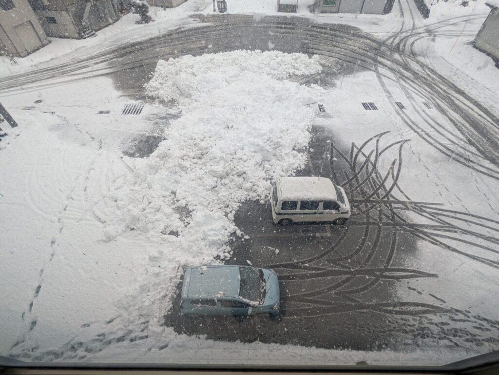 まだ12月上旬ですが まちなかにも除雪が出るほどの積雪となり、コミセン駐車場が狭くなっています。