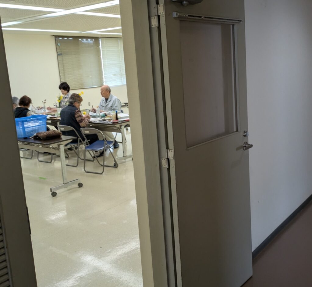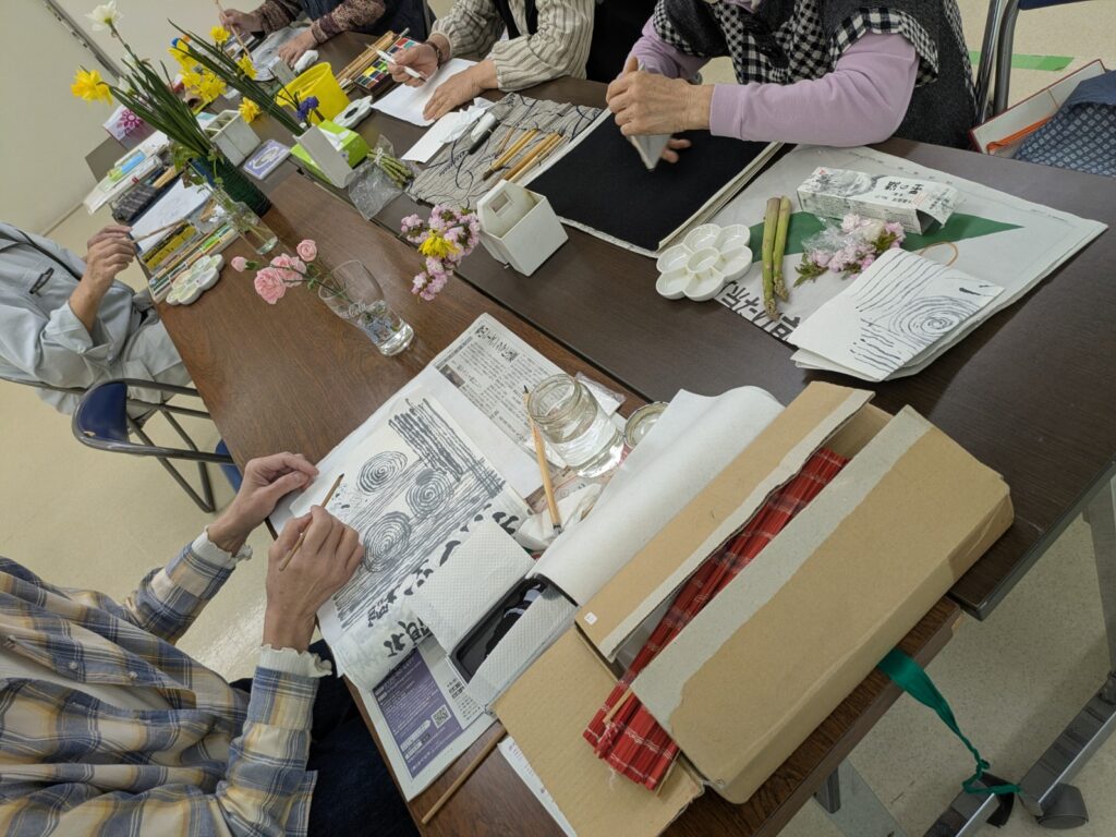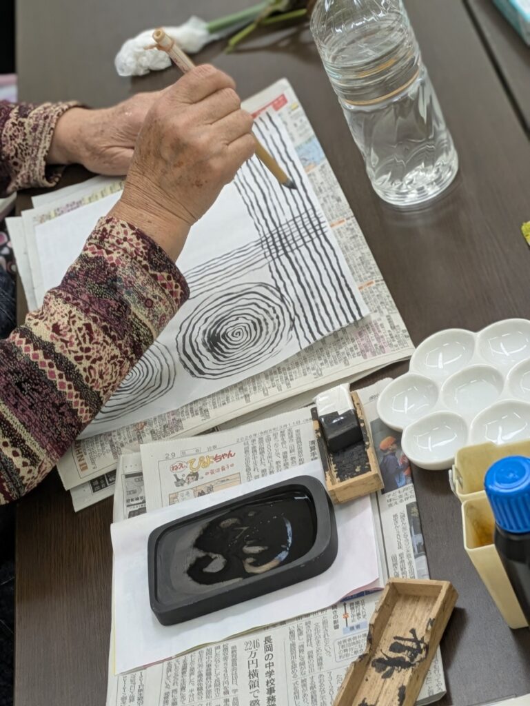 心地よい季節のためか、入り口のドアを開放して行われていた「絵手紙の会」の、作品作りをしているところにおじゃましました。わずかな時間で墨と筆を使い、あっという間にきれいな模様が描かれていきます。