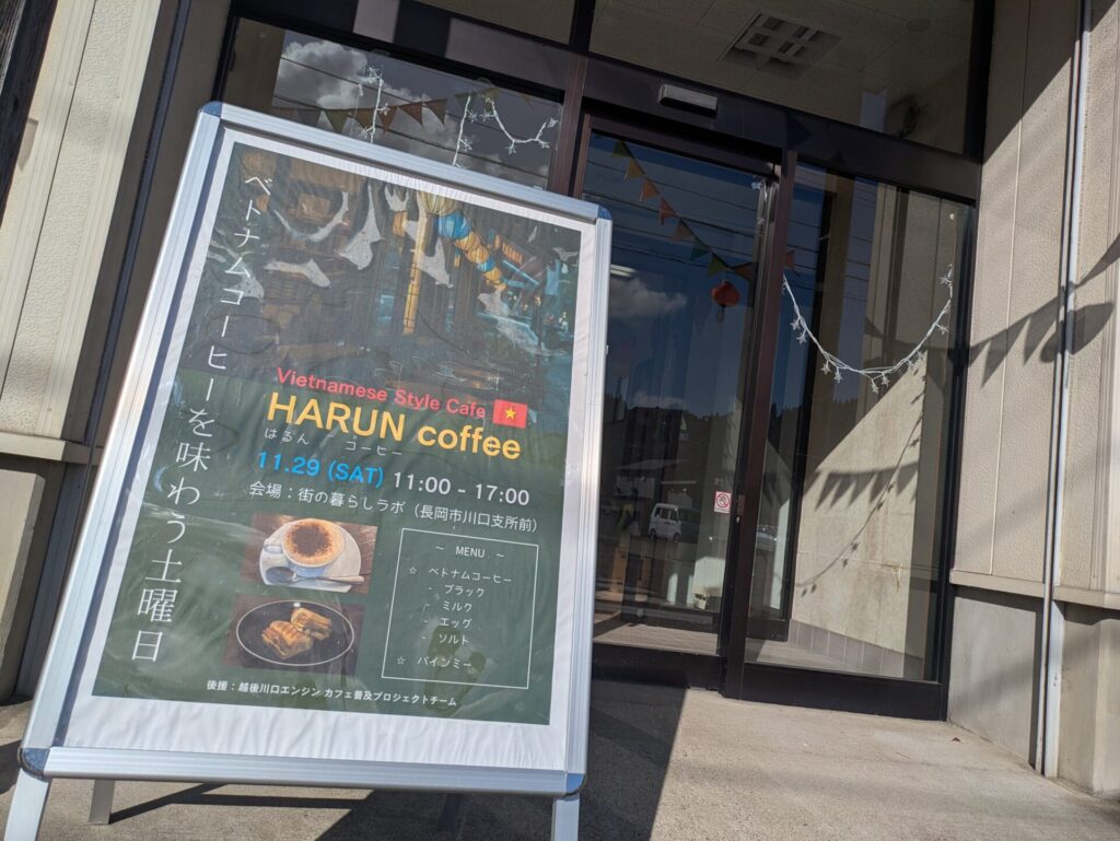 11月29日の日曜日、越後川口まちの暮らしラボ(旧大光銀行越後川口支店)に、ベトナムコーヒーがやってきました。ベトナムコーヒーを提供してくれたのは「HARUNCoffee 」(はるんコーヒー)のみなさま。