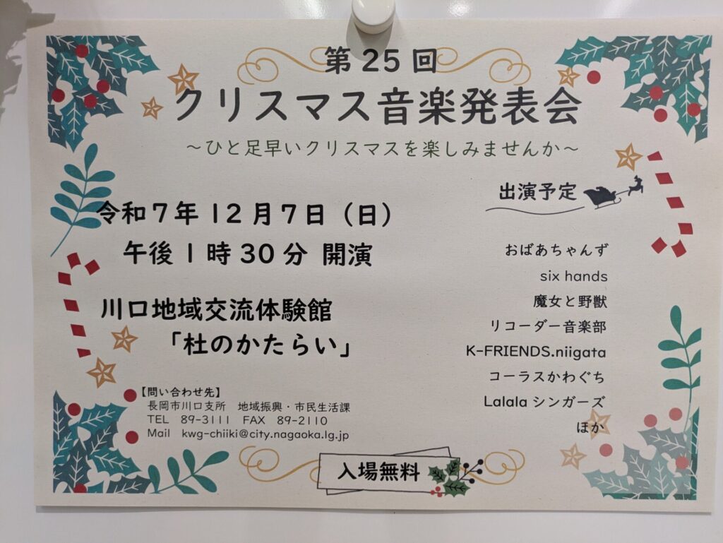 12月7日の日曜日、杜のかたらい(川口温泉のとなり)で「クリスマス音楽発表会」が開催されます。