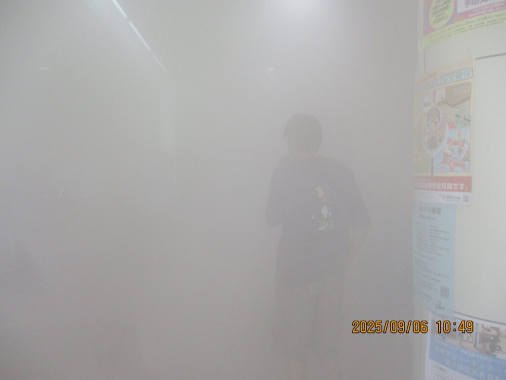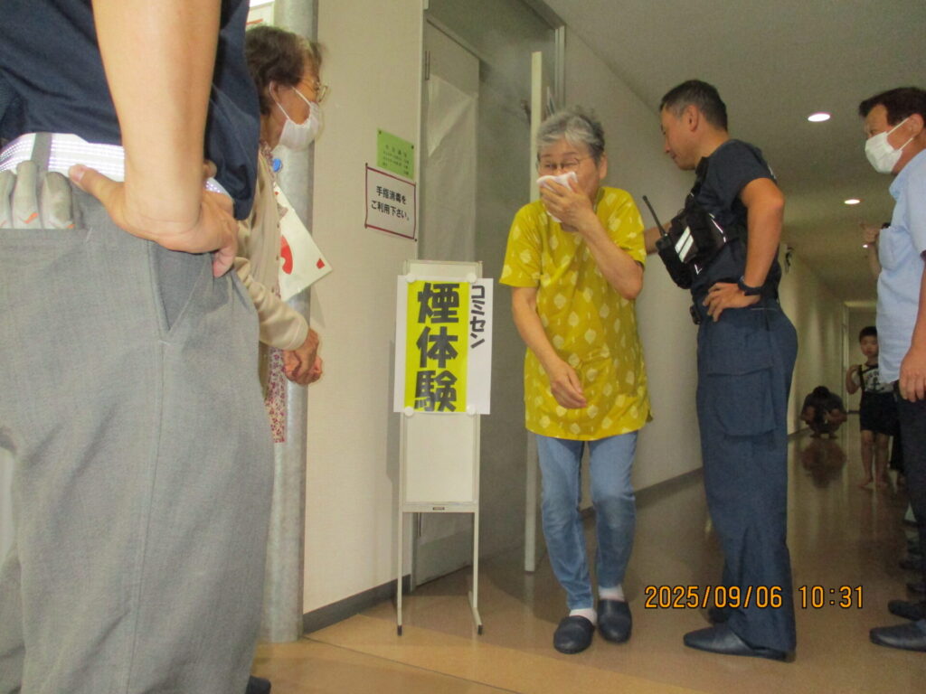 コミセン小会議室に煙を充満させ、ほとんど何も見えない中を避難する訓練をしました。参加者の大半が煙体験が初めてで、煙の中を避難する大変さを実感していました。訓練では害のない煙の中ですが、実際には煙たく、息苦しく、目にも沁みたりするのだろうと思うと、恐怖を感じてしまいます。