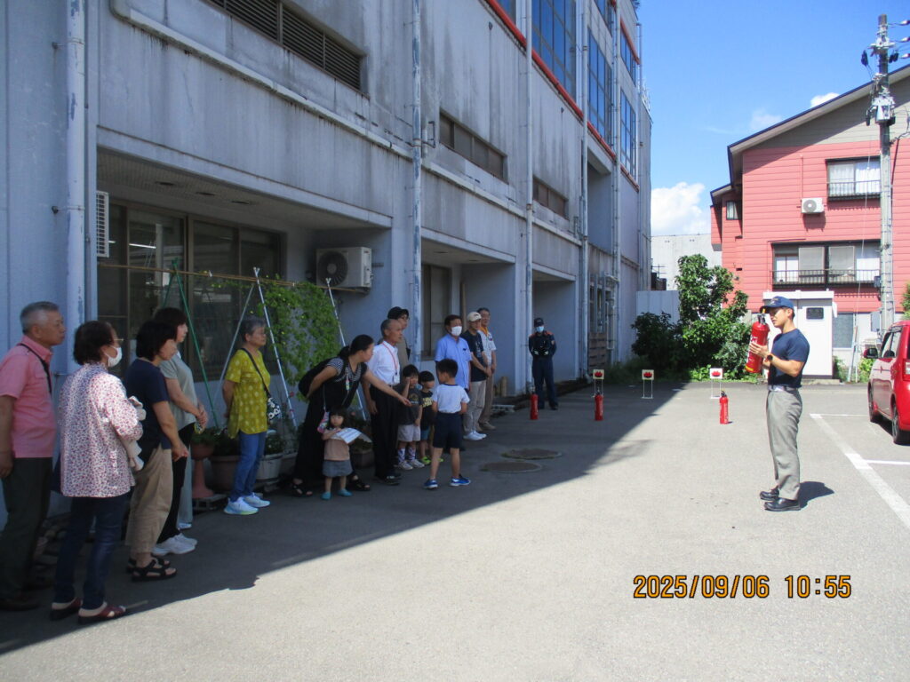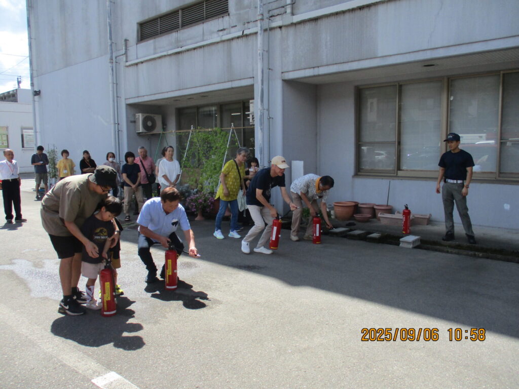 煙体験の後は水消火器による初期消火訓練です。参加者の皆さんは、消防署職員の説明に真剣に耳を傾け、実際に消火訓練をする際には、大きな声を出しながら的に水を当てていました。