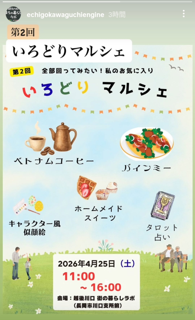 4月25日の土曜日、越後川口まちの暮らしラボ(旧大光銀行越後川口支店)で第2回目となる「いろどりマルシェ」が開催されます。チャレンジショップ的な出店を受け入れているまちの暮らしラボで、前回も人気だったベトナムコーヒーやバインミー、ホームメイドスイーツに占い、さらに今回はキャラクター風似顔絵とお楽しみ満載のイベントが再びやってきます。