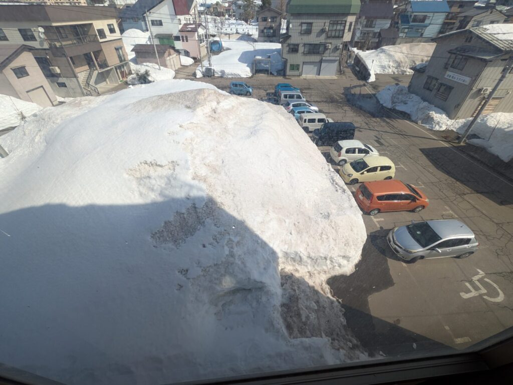 先週末の駐車場の排雪のおかげでコミセンの駐車スペースが少し広くなり、20台くらいは駐車できそうになりました。それでも今年の大雪、道路除雪による雪山はまだ大きく、見通しが悪くなる曲がり角などでは運転に注意が必要ですね。上から見た駐車場の様子