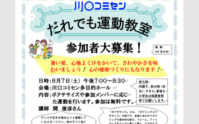 | 参加方法 | 8月3日までに、チラシにある申込票により、持参(9:00~16:00)又はFAX、メールで川口コミセンへ申し込む。 |