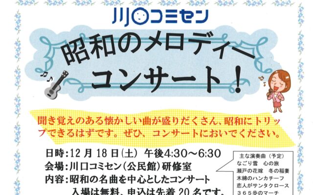 12月18日(土)午後4時30分から6時30分、川口コミセン(公民館)研修室で、昭和の名曲を中心としたコンサートを実施します。主な演奏予定の曲は、なごり雪、冬の稲妻、木綿のハンカチーフ、心の旅などです。会場の関係で、先着20名とします。申込を待っています。