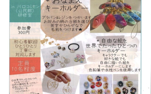 6月19日(日)13:00~16:00 コミュニティセンター研修室で、川口コミュニティ推進協議会・文化スポーツ部会が担当で、下記チラシのようにレジンアクセサリーをつくります。先着10名、参加費300円となります。皆さんの申込を待っています。