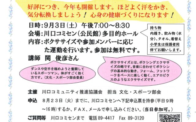好評につき、今年も開催します。ほどよく汗をかき、気分転換しましょう。ボクササイズなど参加メンバーに応じた運動を行います。開催日時は9月3日(土)午後7時から8時半、締切りは8月23日(火)です。心身共にリフレッシュして残暑を乗り切りましょう。