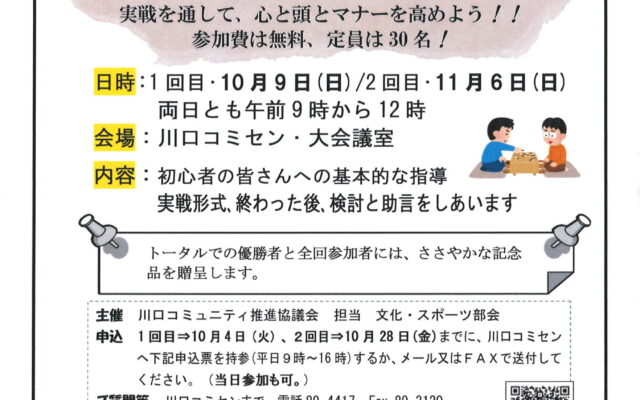 実戦形式などで2回シリーズの囲碁・将棋の会を開催します。期日は、10月9日、11月6日で、会場はコミセンです。9月20日に、チラシを各戸配布しました。詳細はチラシをご覧ください。