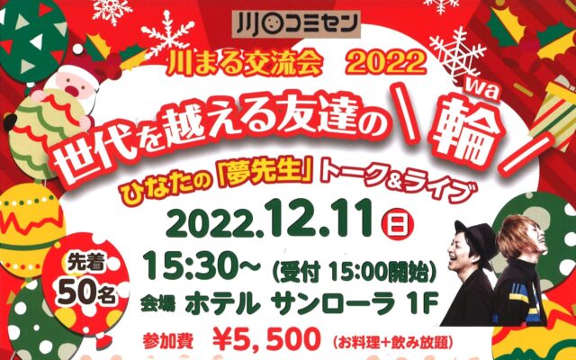 ≪世代を越える友達の\輪/≫というテーマで、12月11日(日)にサンローラ川口にて、川まる交流会を行います。今年度川口観光協会観光大使となられた「ひなた」のお二人のご協力でのトーク&ライブを交え、美味しいお料理やお飲み物を楽しみながら、いろんな方と交流し、一緒に川口について良い事、困っていることなどを気軽に話して、楽しい時間を過ごしていただければと思います。申込締め切りは11月30日(水)午後4時まで。先着50名様です。
