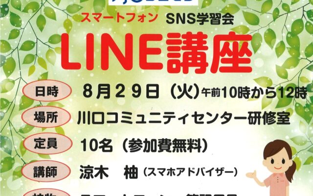 8月29日(火)午前10時から、川口コミュニティ推進協議会まちづくり部会主催の「LINE講座」を開きます。LINEの基本操作や活用方法、また日頃スマートフォンを使っていて分からないことなど、講師とスタッフが分かり易く説明します。お気軽にご参加ください。