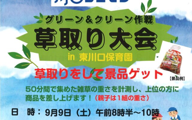 9月9日(土)川口コミュニティ推進協議会まちづくり部会主催の、グリーン&クリーン作戦「草取り大会」in東川口保育園、を開催します。50分間で採った草の重量の多い方には景品あり!!みんなで楽しみながら、子供たちの遊ぶ園庭を綺麗にして景品をゲットしましょう。たくさんの参加お待ちしております。