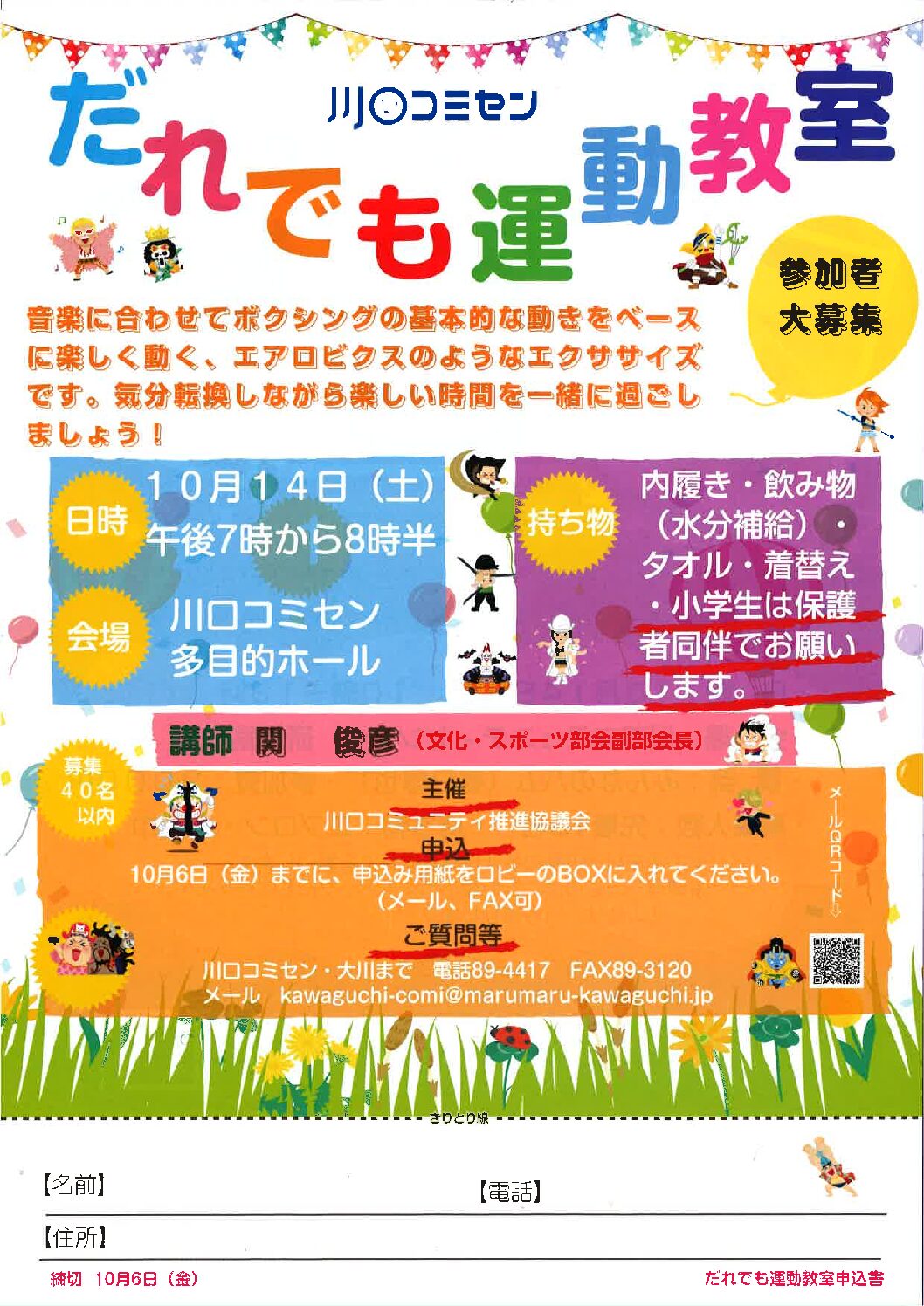 文化・スポーツ部会の恒例イベント、だれでも運動教室を10月14日(土)午後7時から8時半まで開催します。