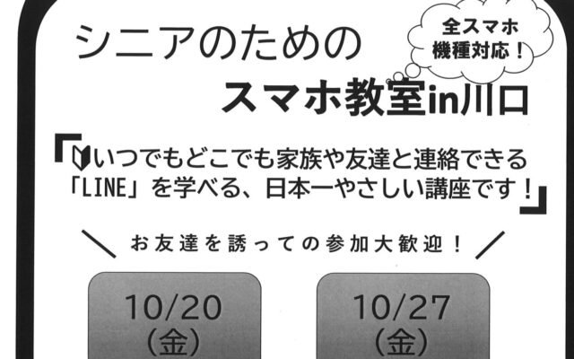いつでもどこでも家族や友達と連絡できる「LINE」を学べる、日本一やさしい講座です!気軽にご参加ください。お友達を誘っての参加も大歓迎!10/20(金)10/27(金)の2回通しての講座となります。定員は15名。電話にて受付いたします。