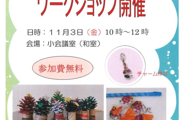 このイベントは終了しています11月3日 午前10時~12時 小会議室(和室)のコミセンコーナーでワークショップを開催します。①松ぼっくりリース作り②チャーム作り③お菓子釣り、どれも参加費無料です。是非立ち寄ってください。お待ちしております。
