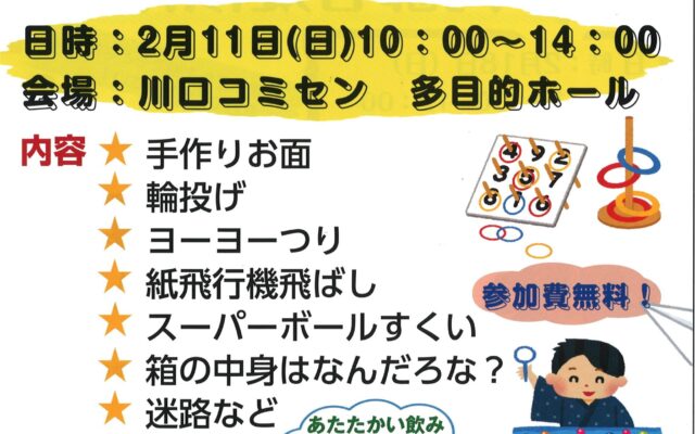 2月11日(日)ミニ縁日を開催します。なかなか外出できない寒い冬をみんなのパワーでぶっ飛ばしてみませんか?冬だけど夏祭りみたいなイベントです。みんなで縁日ごっこを楽しみましょう。