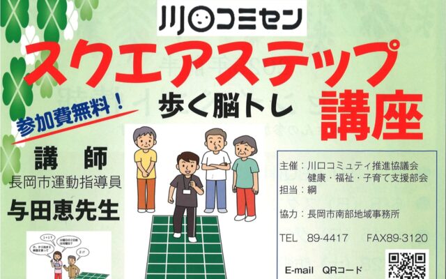 6月8日(日)に昨年も大好評だった【スクエアステップ講座】を開催します。転倒予防や認知機能向上に効果なエクササイズです。 多数の参加をお待ちしております。