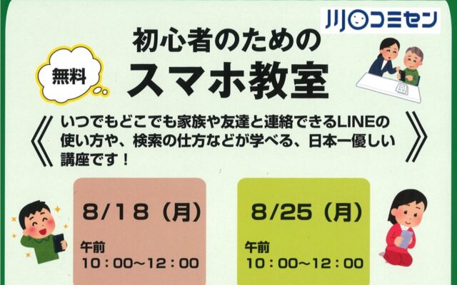 今年は、8月18日(月)と8月25日(月)の2回を通しての講座となります。内容は、LINEの使い方や、検索の仕方などです。講師が丁寧に分かり易く説明してくれる、とても優しい講座です。お友達を誘って気軽にご参加ください。