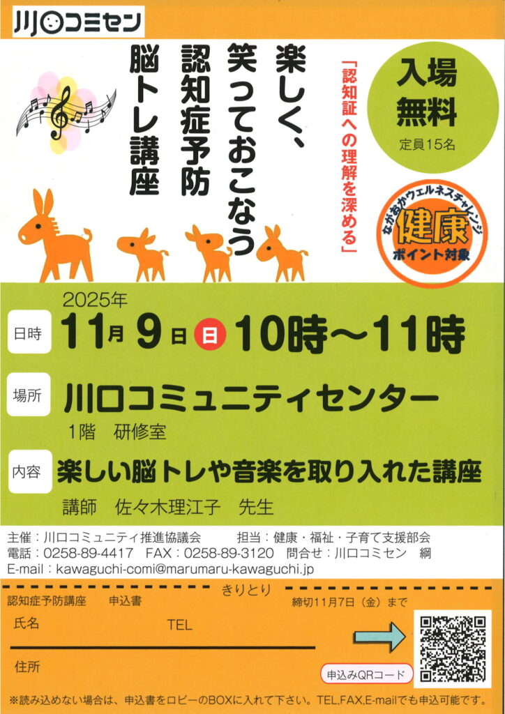 11月9日(日)午前10時~11時 コミセン研修室で講師(佐々木理恵子さん)を招いて、音楽を取り入れた楽しい認知症予防と脳トレを行います。家族、お友達を誘って参加しませんか!