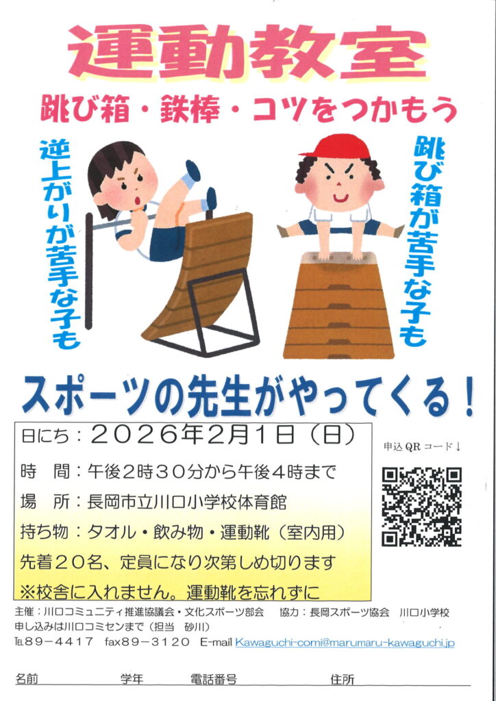 | 連絡先 | 川口コミュニティ推進協議会 文化スポーツ部会(川口コミセン) TEL:0258-89-4417 |