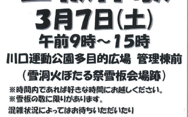 好評だった雪板体験が今年も開催決定!3月7日の土曜日、9時から15時、場所は雪洞火ぼたる祭雪板会場跡。