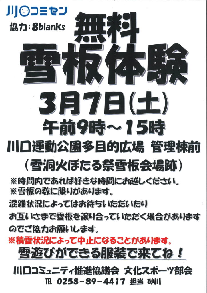 昨年の様子はコチラ➜3月2日、雪板体験が開催されました – まるまる川口