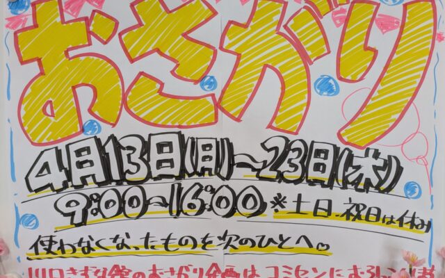 | 参加方法 | 使えるのに使わなくなったものを次の人へ「おさがり」する企画。 おさがりの持ち込みの受付は平日9:00~16:00、川口コミセンまで。 お気に入りを見つけた場合のお持ち帰りは9:00~閉館まで、土日祝日も可。 ※お持ち込みいただいた品物が残った場合は持ち込んだ方がお持ち帰りください。 |
